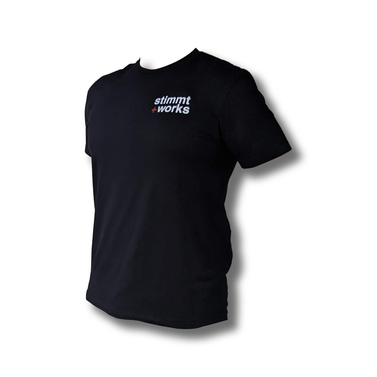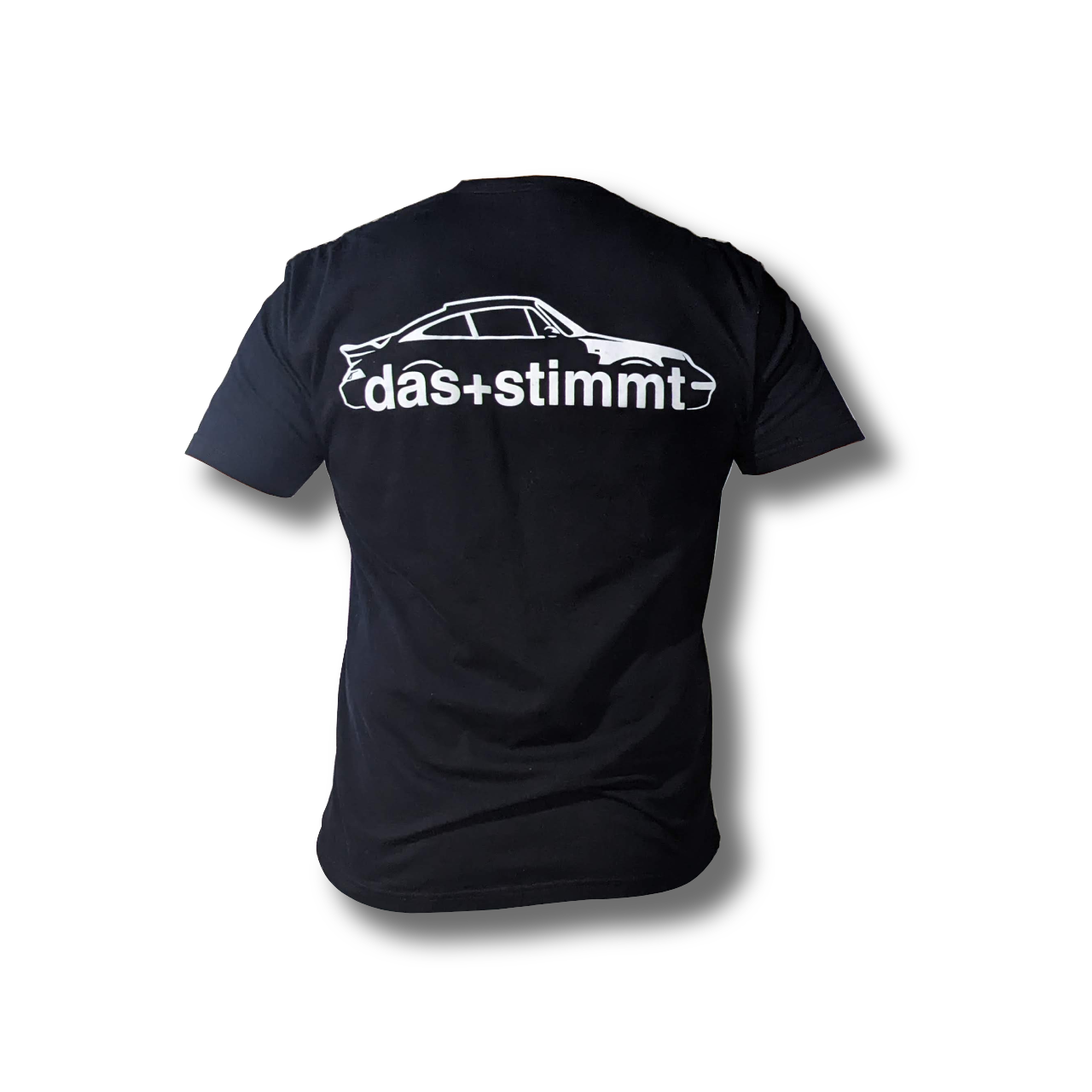 Represent in style with our classic Das Stimmt! tee. The front features a Stimmt Works logo over the left breast with a 993 Turbo silhouetted prominently on the back.